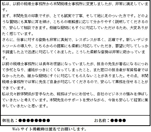 私は、以前の税理士事務所から本間税理士事務所に変更しましたが、非常に満足しています。